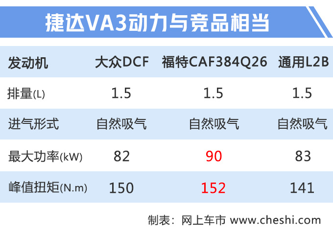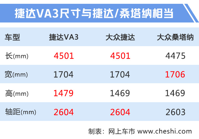 捷达VA3外观、内饰基本与已经停产的大众捷达保持一致,细节方面采用捷达品牌设计元素。车身尺寸方面,捷达VA3仅车身高度与大众捷达有小幅调整,整体尺寸稍小于别克英朗、现代悦动、福特福睿斯等竞品。新车动力上仅搭载1.5L自然吸气发动机,满足国六排放标准,传动系统新车匹配5MT、6AT变速箱,百公里对应油耗分别为5.7L、5.6L。
