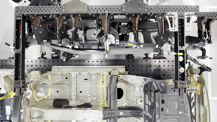 与铝合金、钢等普通材料相比,碳纤维的使用让极星在整车的打造中不得不克服更大的困难。以整车车身结构粘合成型为例。