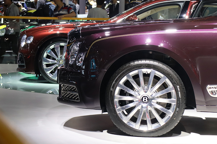同样作为世界级豪车的宾利,在轮圈的设计思路上也和劳斯莱斯有着诸多相像之处。在宾利展台上的两款大型车——慕尚长轴版和新飞驰,都采用了多辐式轮圈。只不过慕尚长轴距版的辐条更为笔直,用端正的线条来彰显慕尚位于品牌内的顶级地位是再合适不过的设计。