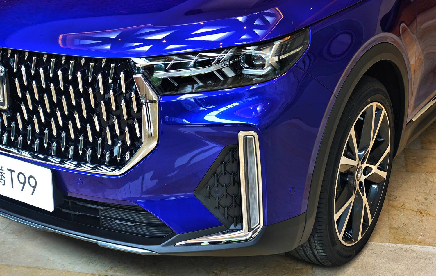 矩阵式远近光LED光源的前大灯组造型十分犀利,并支持有较为独特的动态律动点亮及缓慢熄灭的效果功能。另外在新车前保险杠两侧还新增了纵置旗杆式日行灯,还原概念车设计的垂直式的竖条LED日间行车灯同样在视觉效果上提升了车头的高度,这一设计与此前亮相的T99概念车设计元素相吻合,营造出了较为方正大气的前脸视觉感。