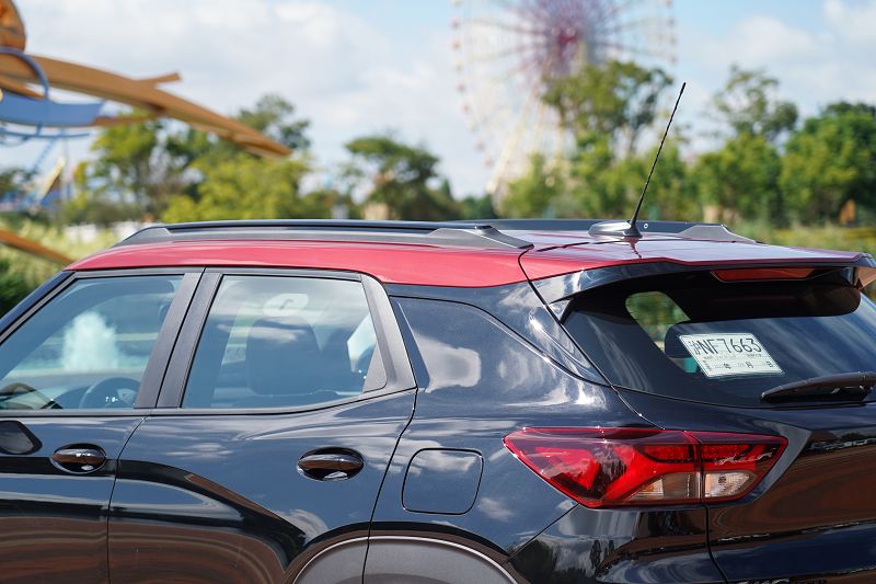 车身侧面,源自传统美系车的Boxing车身折线,以及带有美式肌肉感的腰线设计,更加突显其硬派感。此次试驾车辆的车身颜色为黑色(极夜黑),车顶则采用红色,这样的撞色对比营造出悬浮式车顶造型突显时尚感。