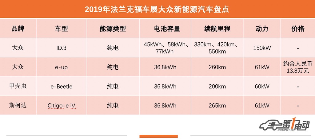 日前,我们获悉了大众在法兰克福车展的新能源阵容,参展车型包括大众ID.3 、大众e-up、甲壳虫e-Beetle、斯柯达CITIGO iV等车型,下面我们就逐一为大家盘点一下。