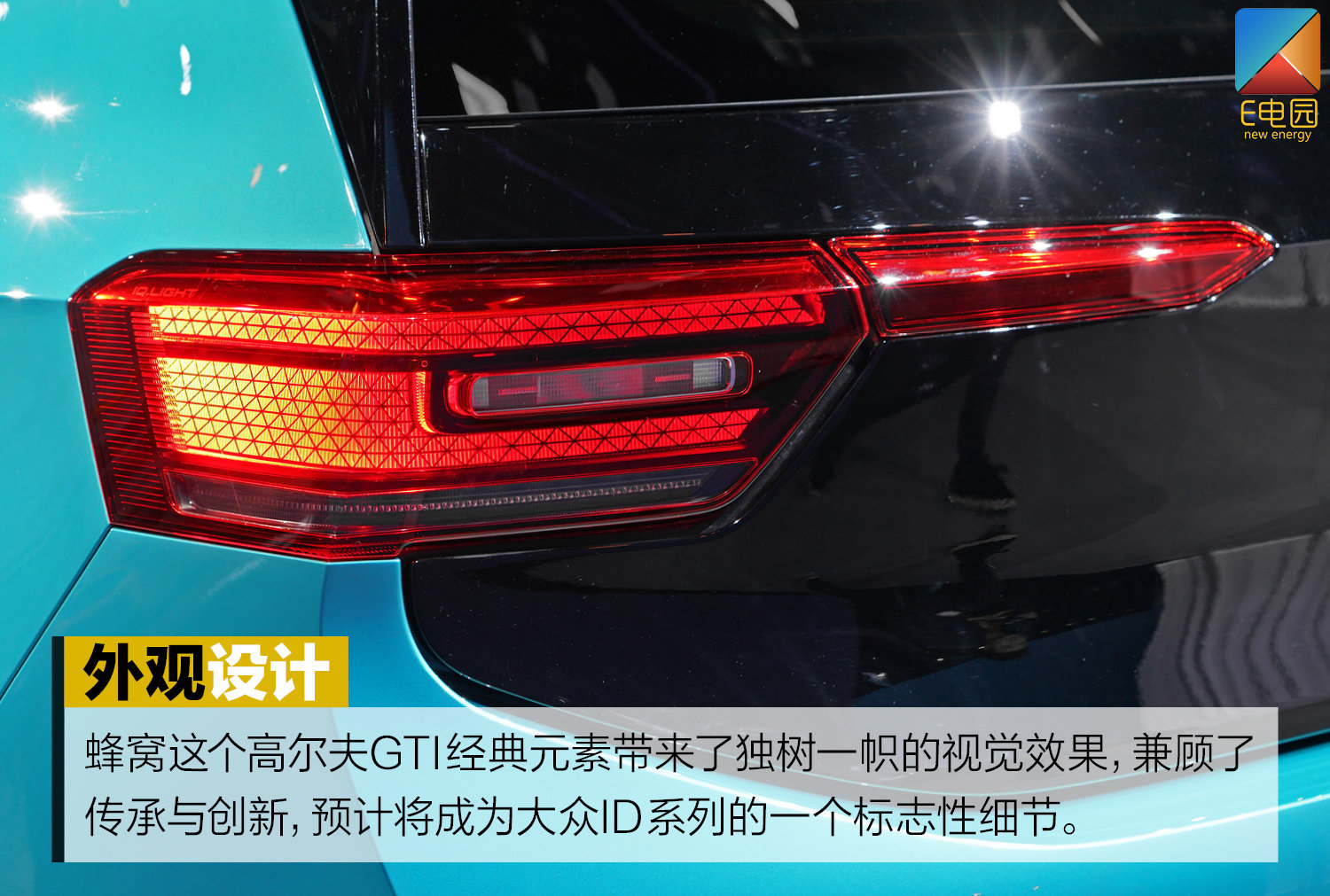 其次,简单的灯组布局一点都不“简单”。远、近光一体的大灯只占头等很小的比例,而LED日间行车灯内外两圈灯带,以及蜂窝状光源相当抢镜。蜂窝造型的大众高尔夫GTI (配置|询价)(参数|图片)经典元素带来了独树一帜的效果,就连同集团“玩灯”最出名的奥迪都没有如此与众不同的设计,这可以说是兼容传承与创新的代表,预计将成为大众ID系列的一个标志性细节。