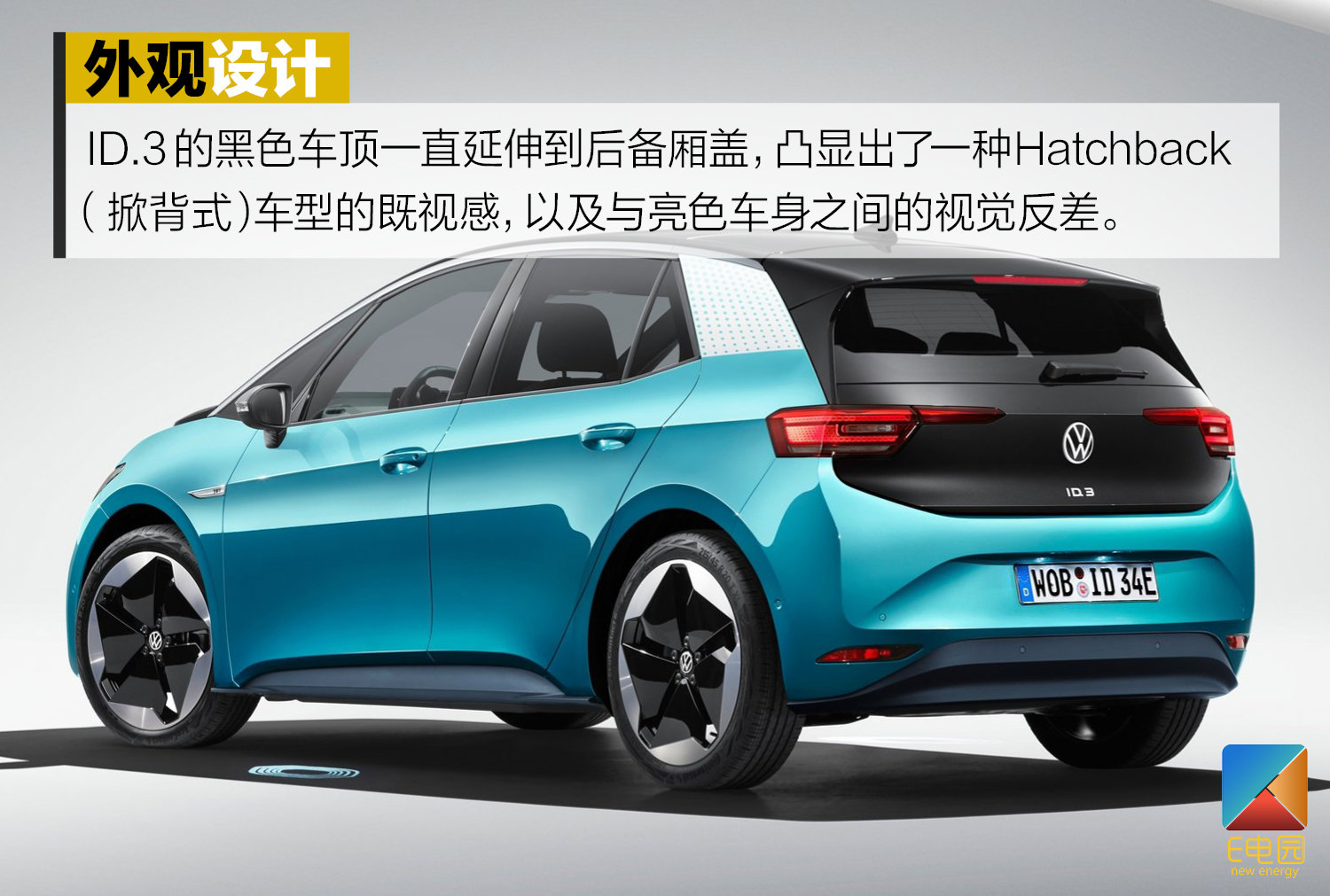 最后,在ID.3最标准的欧洲两厢车造型中,黑色车顶一直延伸到后备箱盖,凸显出了一种Hatchback(掀背式)车型的既视感,以及与亮色车身的反差。