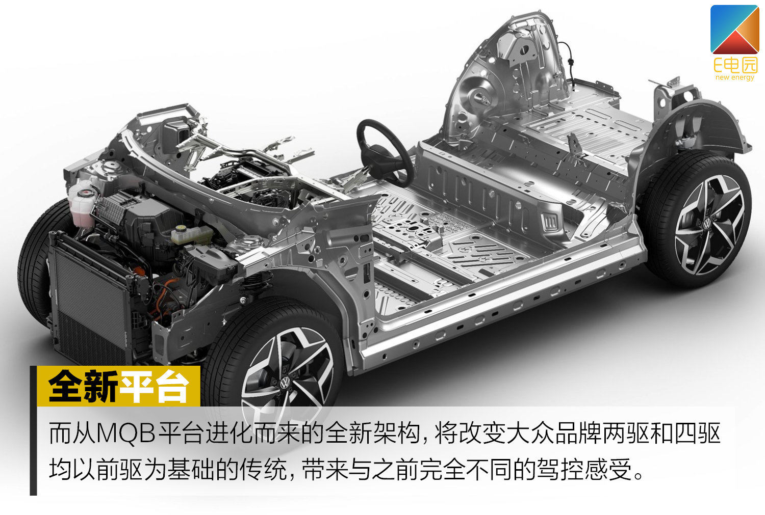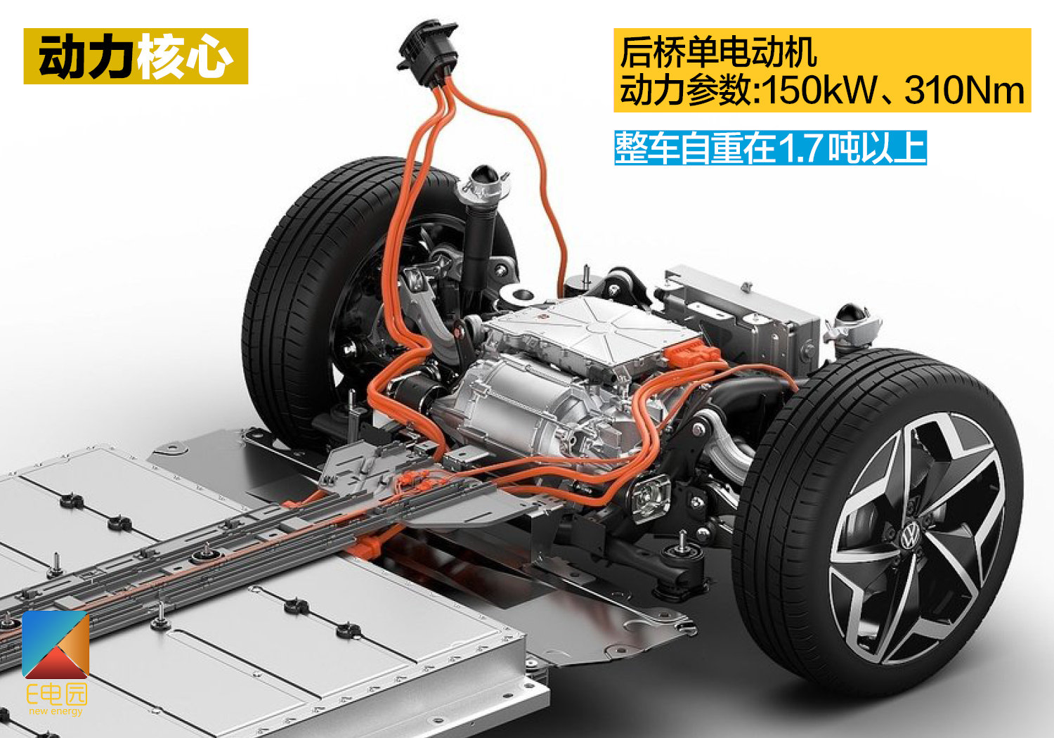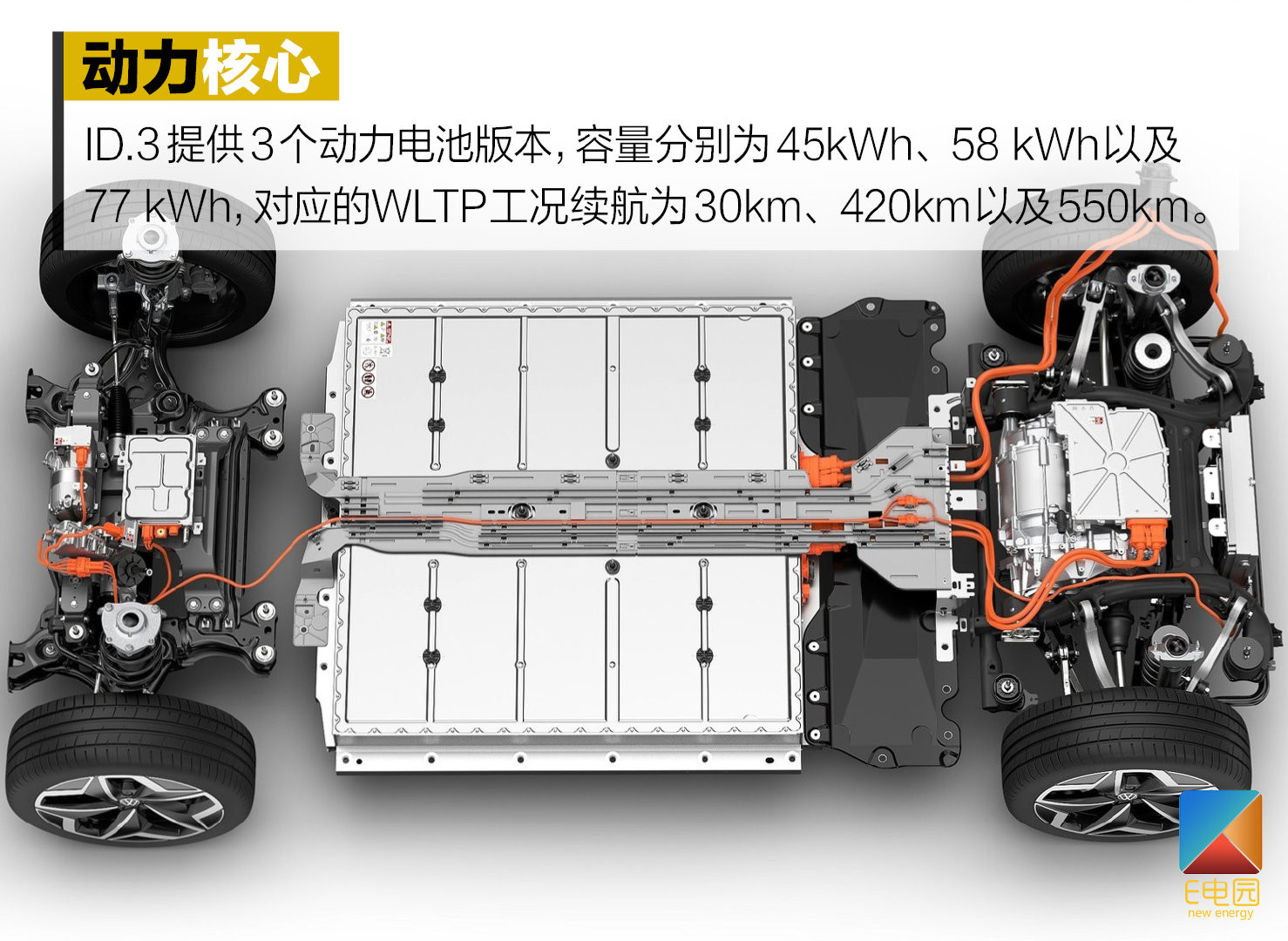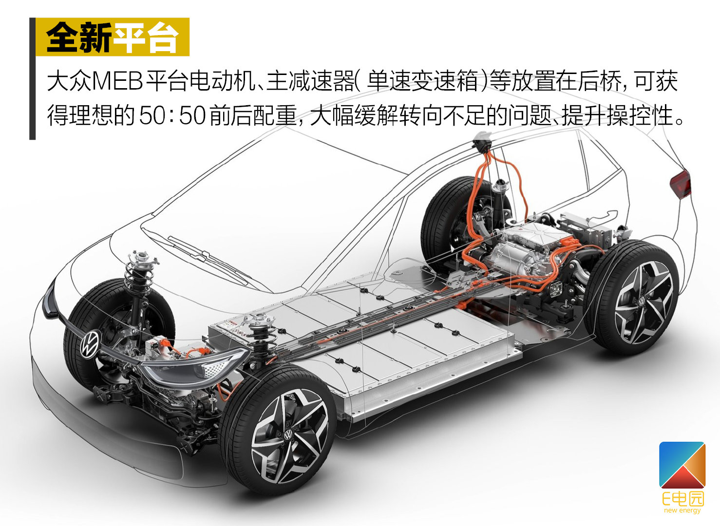 大众MEB以后驱为基础的平台,使得ID.3是一款后驱的纯电动车,电动机、主减速器(单速变速箱)以及电控系统等核心部件紧凑的放置在后桥,可获得理想的50:50前后配重,大幅缓解转向不足的问题、提升操控性。这个从MQB平台进化而来的全新架构,将改变大众品牌两驱和四驱均以前驱为基础的传统,带来与之前完全不同的驾控感受。