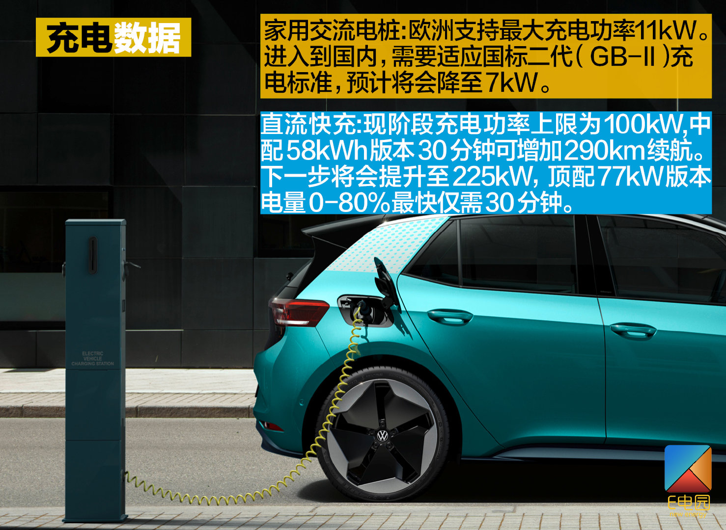 充电方面,ID.3乃至未来更多ID系列电动车,都支持欧洲最大11kW功率的家用交流电桩,而进入到国内要适应国标二代(GB-II)标准,预计将会降至7kW。现阶段直流快充的上限为100kW,展车给出的58kWh版本充电30分钟可增加290km的续航。下一步这个数据将会提升至225kW,最高配77kW版本电量0-80%最快仅需30分钟。