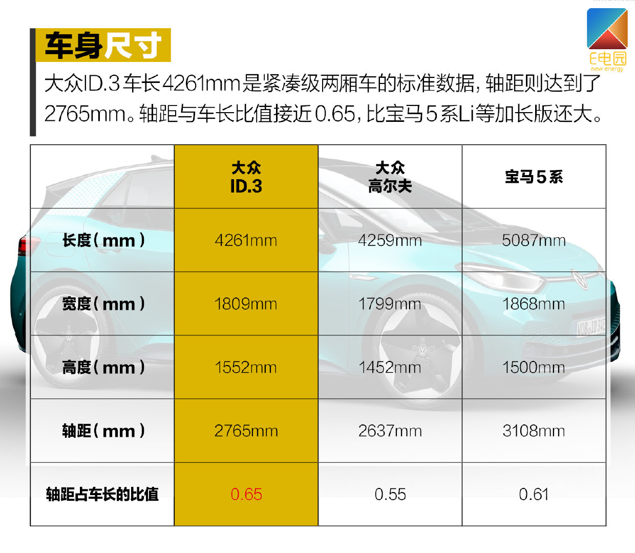首先,大众ID.3是典型的电动车专属平台产物,具备着打破传统燃油车以轴距划分级别的属性,其4261mm的整车长度与燃油版高尔夫相近,却有着2765mm的入门B级别车轴距,轴距占车长的比值接近0.65,比奥迪A6L、宝马5系Li等加长版车型还要大。