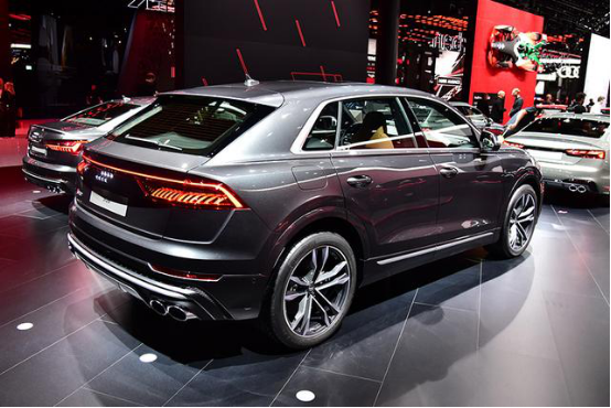 外观上奥迪SQ8依然延续新款Q8的外观,但是车身更低矮一些。采用了奥迪最新的设计的八边形进气格栅并悬挂“SQ8”标识,中网周围银色镀铬饰条包装。相比于Q8,前脸的格状式进气格栅面积感觉更大,更有冲击力。两侧搭配矩阵式LED大灯,极具战斗气息。车侧依然是优雅时尚的Coupe溜背式设计,流畅式的腰线布局,配合独有的21寸/22存V字五幅轮毂和可选的碳陶刹车制动盘,散发强烈运动性能的同时辨识度极高。尾灯采用了时下最新的贯穿式熏黑尾灯,符合当下消费者的喜好。最令人热血澎湃的是SQ8的底部排气管道,采用的是双边共四出口的圆形排气设计,看起来霸气十足,彰显其性能轿跑级SUV的运动基因。