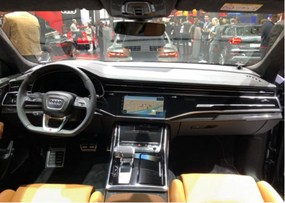 内饰方面与全新Q8并无太大区别,不一样的是撞色的内饰材质氛围搭配全新的跑车式一体式运动型前排座椅和Alcantara材质面料让整车看起来时尚和运动感更强。车载配置上,依然沿用了奥迪Q8的三屏式设计,点击屏幕你会感到明显的触动感,