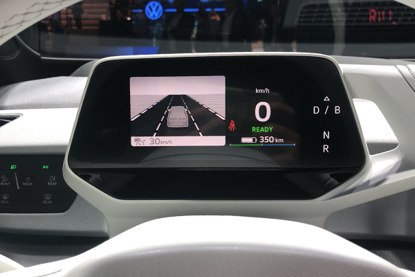 内饰方面,ID.3内配备全液晶仪表盘,可显示时速/剩余电量/剩余续航里程等,电子挡把与仪表盘连为一体,通过转动端部即可实现换挡,在仪表盘右侧也可看到当前挡位。