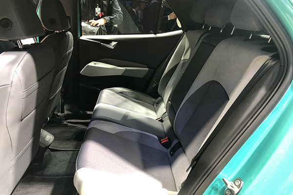 ID.3后排的实际空间与现款的高尔夫是很接近的,腿部的空间并不会局促。因为电池需要平整地布置在整台车的底部,车厢的地台垂直高度多多少少会受到影响。