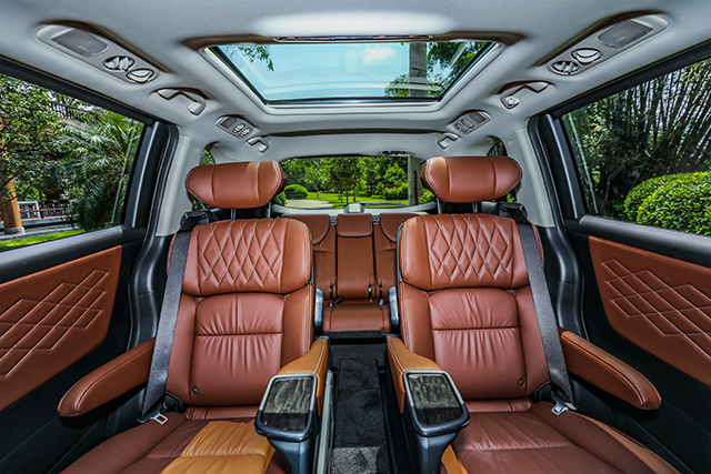 新车采用2+2+3的座椅布局,主驾驶座椅支持8向电动调节,副驾座椅4向手动可调。第二排全能头等舱独立座椅细腻柔软,带有6向调节、电动脚拖、以及座椅加热功能,舒适性极佳。最后一排座椅可支持4:2:4比例放倒,空间更灵活、实用。此外,艾力绅锐·混动还标配分体式电动天窗,为乘客营造开阔、通透的视野。