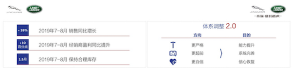 体系调整1.0阶段总体已经达成目标,但捷豹路虎追求的不止于此。1.0阶段的调整主要是提升产品力和盈利能力、将品牌建设清晰明了化、管理公开透明化等工作。在接下来的时间里,捷豹路虎将进一步进行体系调整,进入2.0时代,主要的任务是高度关注销售质量,推进更加精细化和更加科学严谨的考核制度,助力终端销售网络的发展,帮助经销商提升盈利能力。