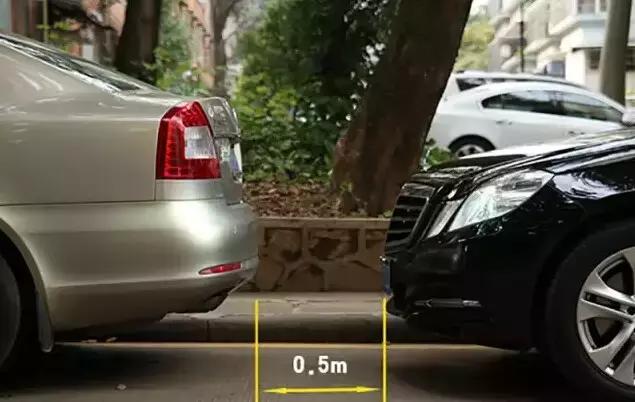 当轿车车头边缘与前车车牌下缘重合,此时与前车的距离大概是0.5米。这时候就两车的距离就是比较合适,可以拉起手刹停车了。