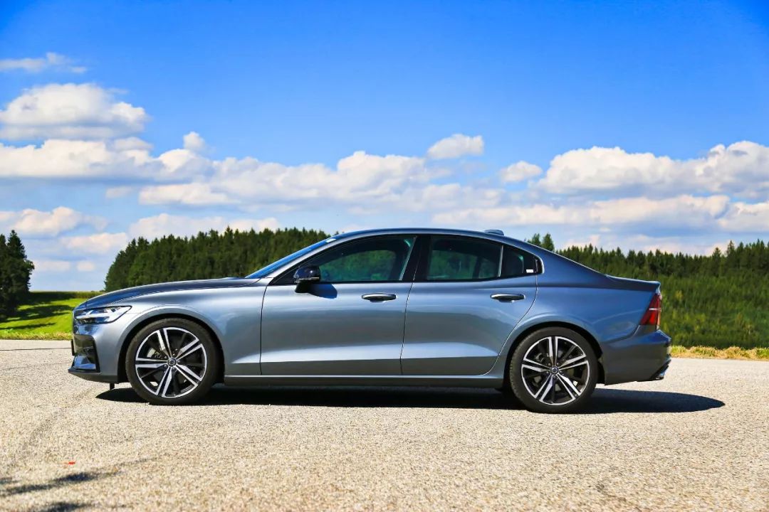 侧面部分,黑色后视镜、黑色车门框都是R-Design版专有的设计。车身下方是19寸银/黑相间的多条辐造型轮圈,搭载的是马牌轮胎,轮胎宽度235mm,扁平比为40。