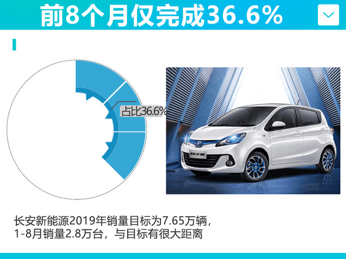 长安汽车官方公布的最新数据显示,今年8月份销售新能源汽车1449辆,今年前8个月,长安新能源累计销售28083辆,仅完成销量目标的36.6%,要知道长安新能源2019年的销量目标(7.65万台)相较于2018年实际销量本身就下调11.87%,显然前8个月的数据并不乐观。