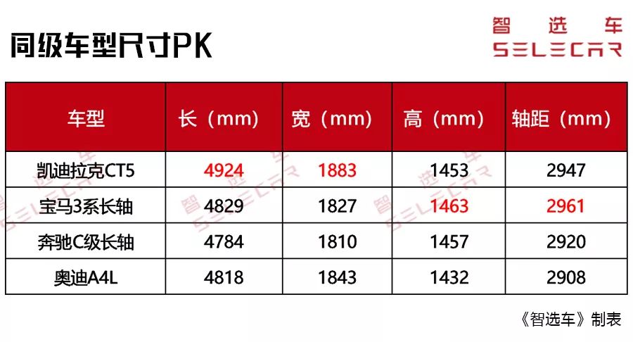 尺寸方面与同级竞品相比,凯迪拉克CT5在长度上超过长轴版3系、奔驰C级和奥迪A4L,宽度上全面领衔同级BBA车型,轴距则仅次于宝马3系长轴距版本车型。