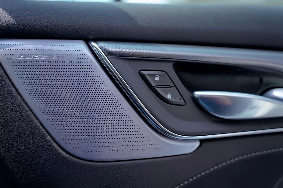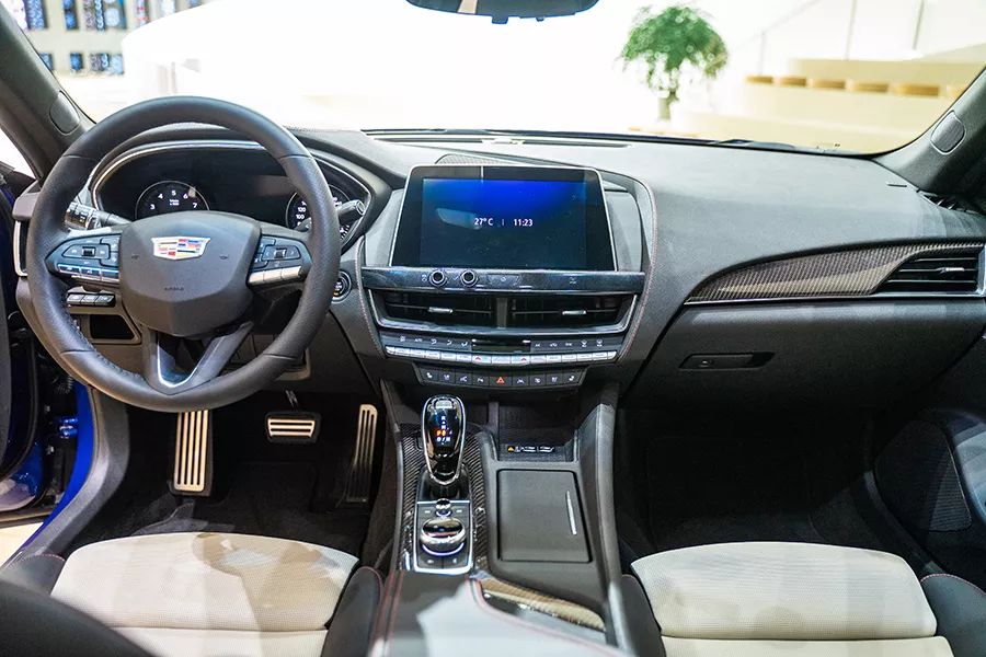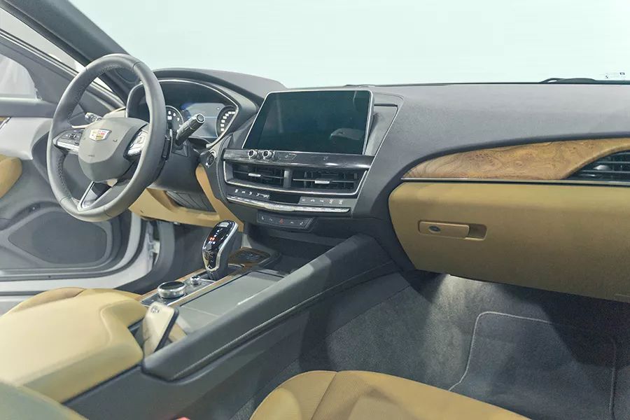 凯迪拉克CT5的内饰设计简洁、时尚。材质方面,中控台上方采用了大量的软性皮质包裹,其触感相当不错;门板扶手、副驾区域、以及挡把周围均采用了碳纤维饰板进行点缀(配置不同,其他版本实拍车型还有木纹装饰),中控下方配有类似盾形的镀铬空调按键;扶手区域的多媒体控制旋钮采用了钻石切割的工艺,视觉感出众;门板处的BOSE音响罩为不锈钢的材质,则进一步凸显了凯迪拉克CT5的内饰质感。