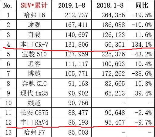 作为曾经最畅销的合资紧凑级SUV之一,RAV4荣放的销量表现将一定程度的决定一汽丰田的整体业绩。今年8月,老款RAV4荣放销量为11629辆,同比上涨5.2%;但其1-8月累计销量则为86193辆,同比下跌9.7%。从整体下滑的态势不难看出,老款RAV4荣放的产品竞争力在老化。相比于此,作为荣放的最大竞争对手,本田CR-V (配置|询价)却在8月实现了逆市上涨,销量达到20431辆,同比上涨54.8%;1-8月,CR-V累计销量则达到131806辆,同比大涨134.1%,无疑是当下最炙手可热的紧凑型SUV。