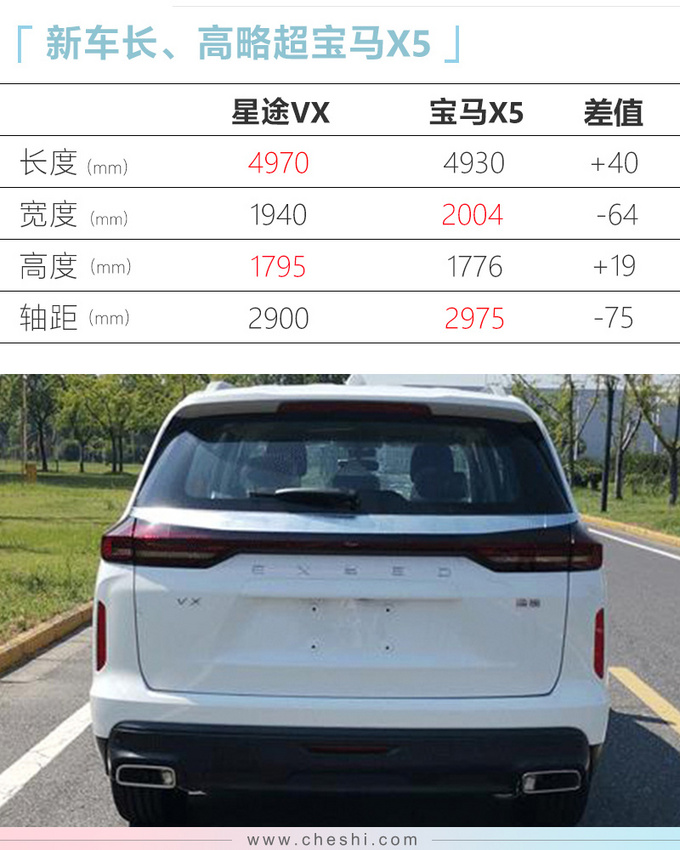 车身尺寸方面,星途VX整体超越星途TXL,长、宽也优于宝马X5。外观方面,新车前脸由3根镀铬饰条连接,和路虎发现十分相似,尾部则采用时下流行的贯穿式尾灯设计。