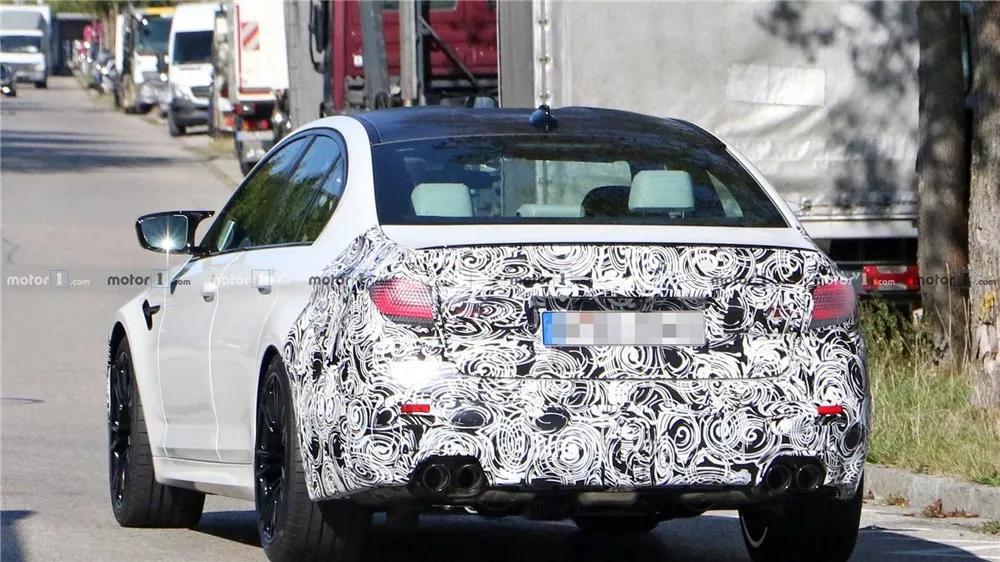侧面还是原本规规矩矩的造型,熏黑轮圈看起来依旧非常运动。不过尾部虽然展露部分尾灯造型,就算做出改动,估计大体与现款M5造型差距不大。尾部小鸭尾、碳纤维车顶和双边共四出的排气依旧保持现款造型。