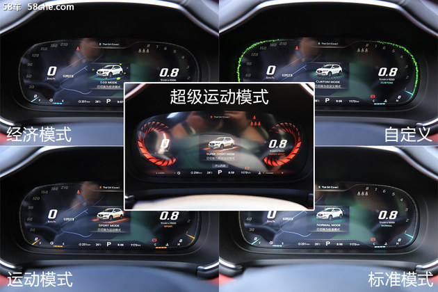 在不同的驾驶模式下,不仅仪表盘会显示不同的设计界面,而且动力表现也不尽相同。按下方向盘右下角的supersport超级运动模式按键,转速会直接升到2300rpm,高转速区域会让油门的响应更加灵敏。