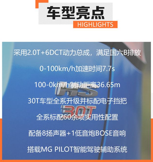 说起名爵这个名字,许多朋友都不会陌生,作为一个以“运动”为核心的汽车品牌,这份运动基因当然要雨露均沾,SUV车型肯定也不例外。标题上的三组数据就是用来介绍我们今天的主角——2019款名爵HS 30T车型,7.7s代表零百加速;36.65m代表100-0km/h制动;最后是其换装了满足国六B排放的发动机,那么这款车的表现究竟如何?我们接着往下看。