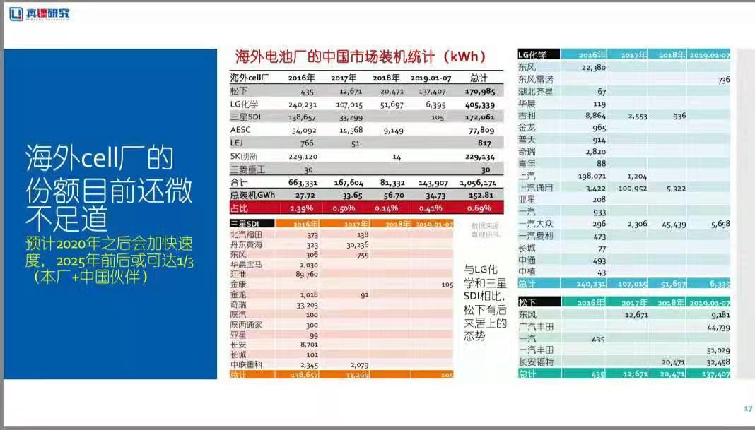 “预计2020之后(补贴完全取消之后)他们会发力,且短期内市场份额可能会有快速提升(因为基数低)。海外电池厂的优势是产品品质相对更优,其他都差不多,但品质优势也有可能两三年之内被赶上。”