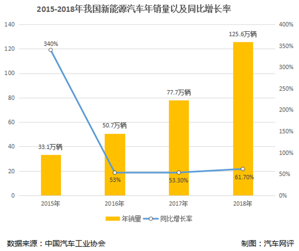 我们看一下数据。2015年,我国新能源汽车整体销量为33.1万辆,相较于2014年上升了340%,随后,2016年销量则上升了53%,2017年上升了53.3%,2018年上升了61.7%,销量逐年上升且幅度不小。