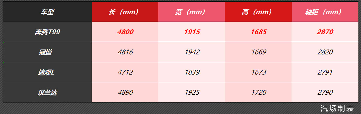 车身尺寸方面,奔腾T99长宽高分别为:4800mm/1915mm/1685mm,轴距为2870mm。