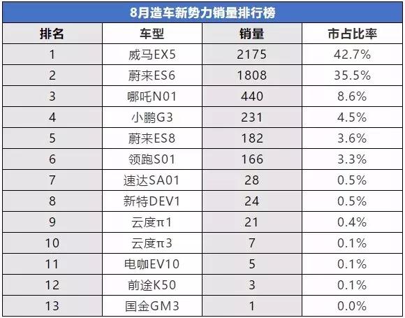 从销量来看,造车新势力似乎从“三巨头”变成“双巨头”,威马和蔚来销量共计4165辆,把持82%的市场份额。