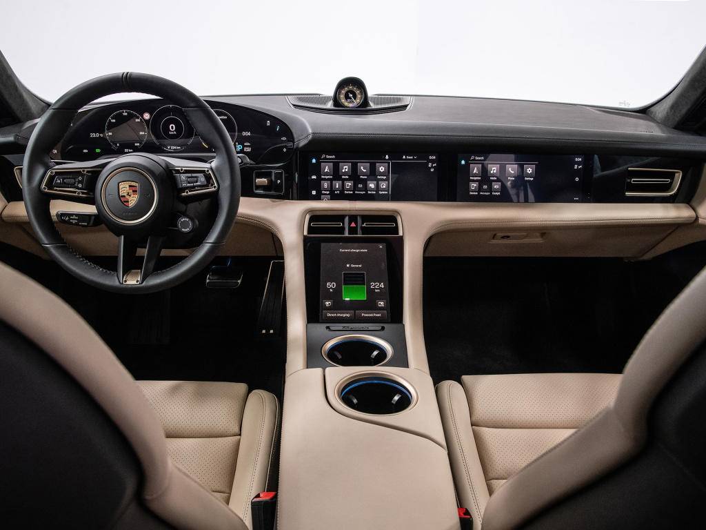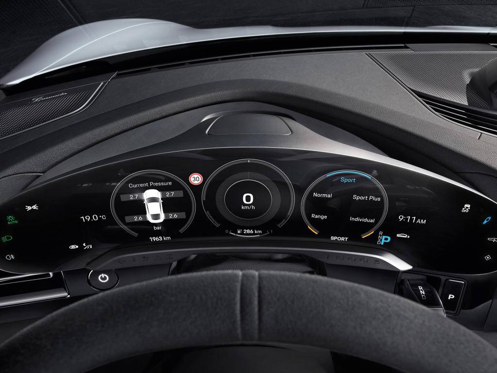 如果说外观设计足够惊艳,那么内饰给人的惊喜就少了很多,因为这里才是真正像初代911致敬的地方,当然也几乎沿用了Mission E的内饰设计,比如说四屏联动,绝对保证比奥迪、奔驰的三屏或双屏更惊艳,尤其是仪表盘的16.8英寸曲面屏,既有保时捷的经典也有当下最流行的视觉效果。值得一提的是,Taycan的换挡机构不在常规位置,而是和保时捷918 Spyder的造型接近,在方向盘右侧,未来你有幸体验到它的时候可要表现出开过的样子哦。另外就是方向盘,会根据车型不同提供不同材质,肯定是Turbo S更出色。