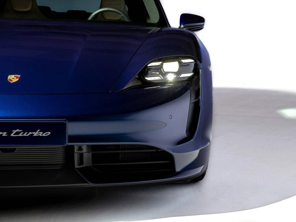如果你对于保时捷有过多的关注,应该知道Taycan是基于Mission E概念车打造而来,所以看到实车后大家也不会特别陌生,基本还原了概念车的设计,比如头灯造型、下格栅等细节,都与概念车保持了高度一致。按照官方的说法,Taycan虽然是一款纯电动车型,但它却有很多细节设计致敬保时捷初代911车型,所以定位跨界且未来,但它给人的感觉依旧熟悉又亲切。要说前脸的亮点,或许是四点式的LED大灯,科技感非常不错,再配合下进气格栅的空气导风板、下凹式车头等保时捷经典的设计语言,确实很有性能跑车的感觉。