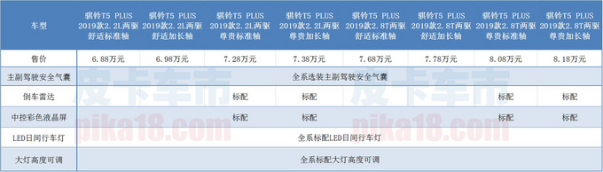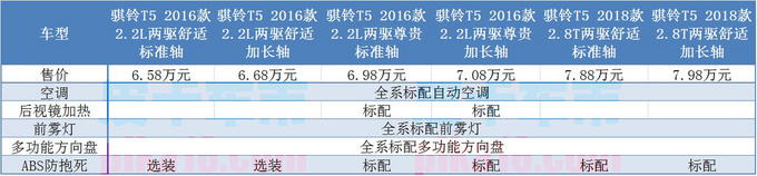 骐铃T5有着6.58万-7.98万的售价,使消费者的购车成本更加低廉。同时,该车无论是动力还是承载能力均有着出众的表现,对于动力、省油需求较高的用户,推荐选择2018款柴油机型。同时,其舒适版、尊贵版在配置上有所不同,其中尊贵版配备了后视镜加热、ABS防抱死功能,可以提升车辆在恶劣环境中的用车安全性。