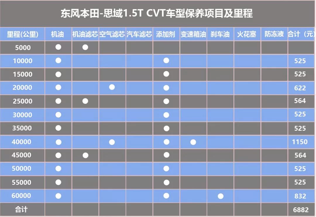 根据厂家建议,思域的保养周期为5000公里,小保养费用为525元,大保养则为622元,费用最高为60000公里的保养,需要1200元。虽然思域大保养的费用并不算高,但是首保后每次保养都需要使用燃油添加剂,以及总体保养次数较多,因此整个60000公里周期保养费用并不算特别低,共需6722元,折合每年保养费用为2240元。最后得出思域2019款220TURBO CVT劲动版每年用车成本为21638元,每月平均1803元。