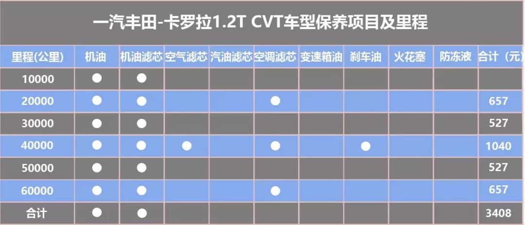 卡罗拉的建议保养周期与思域并不一样,保养间隔为10000公里,首保为10000公里,无需费用。厂家建议使用的是全合成机油,每次更换所需机油的费用将近400元,小保养费用527元。费用最高的40000公里保养,需要1040元。卡罗拉60000公里的行驶周期中需要自费的保养次数仅为5次,因此保养费用只有思域的一半,合计为3408元。最后得出卡罗拉2019款1.2T S-CVT GL-i精英版的每年用车成本为17716元,每月平均为1476元。