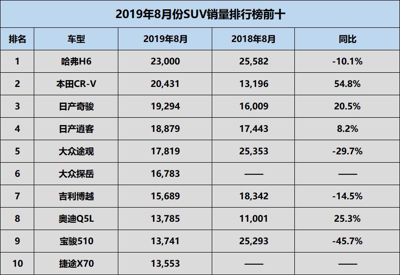 2019年8月份的销量新鲜出炉,从销量排行榜来看,之前一直以自主品牌为天下的SUV车型,在近几个月中合资车型卷土重来,纷纷登榜排行榜。而我们在排行榜前十名中,也看到了多款合资品牌的身影。