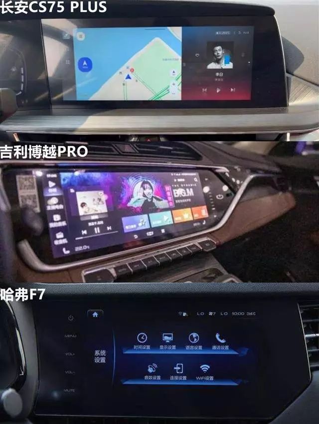 CS75 PLUS和博越PRO都是采用7英寸全液晶仪表盘+12.3英寸液晶中控屏的布局,不过CS75 PLUS的双屏连接设计,看起来科技感更强。哈弗F7则采用的7英寸液晶仪表盘+9英寸液晶中屏,相比CS75 PLUS和博越PRO稍显劣势。