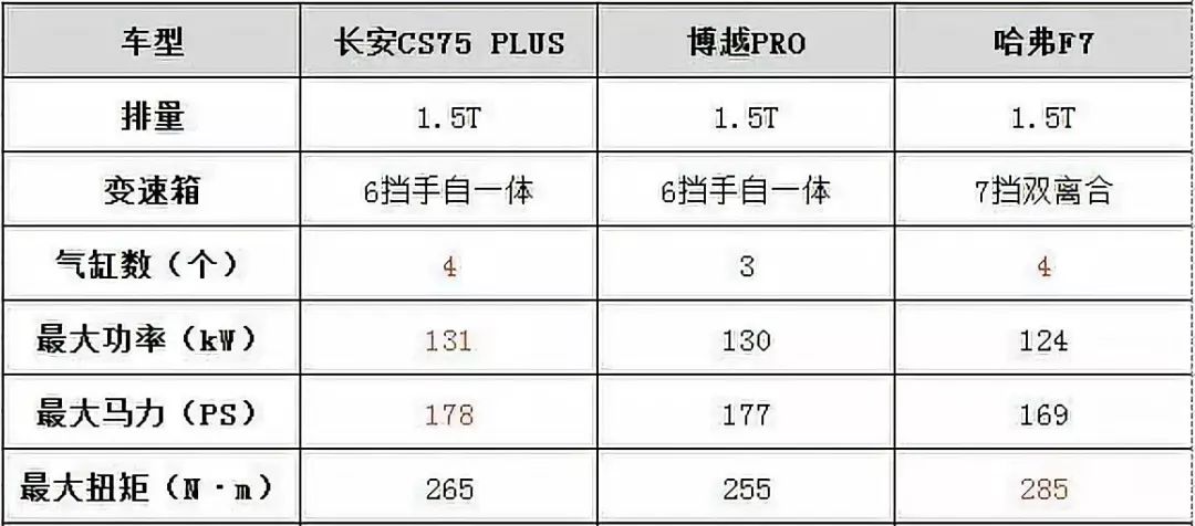 再看看动力方面,CS75 PLUS搭载的是长安蓝鲸1.5T发动机和爱信6AT变速箱。哈弗F7搭载的是长城自主研发的1.5T发动机和7速双离合变速箱,博越PRO则搭载的吉利与沃尔沃联合研发的1.5T 三缸发动机和爱信6AT。从账面数据来看,CS75 PLUS和博越PRO的最大马力基本持平,哈弗F7落了下风。但在最大扭矩上,哈弗F7优于其余两款车。