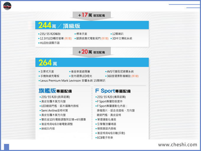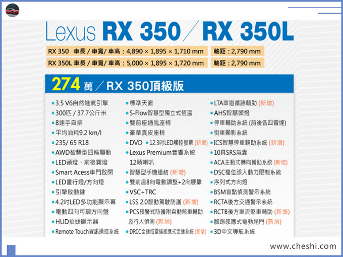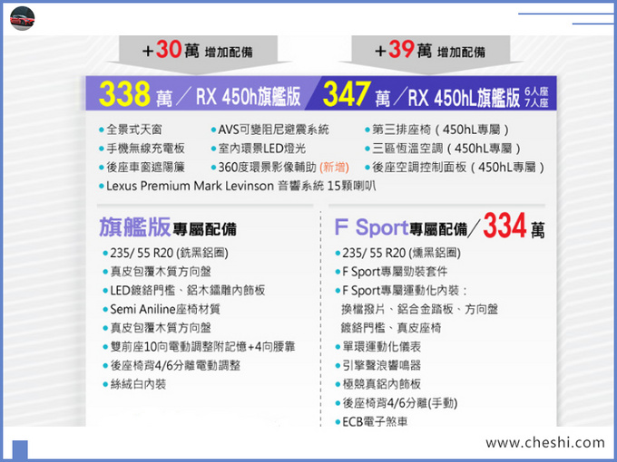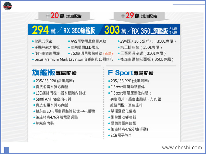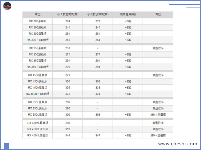 目前国内市场销量较为火爆的豪华中大型SUV非奔驰GLE (配置|询价)、宝马X5、奥迪Q7 (配置|询价)莫属,而雷克萨斯旗下RX车型却没有BBA系列车型热度高涨,但其较为亲民的豪华SUV售价还是吸引着诸多消费者前来买单,而独具一格的匠心工艺更是赢得了诸多日系车迷们的芳心。目前据台湾汽车媒体报道,雷克萨斯新款RX (配置|询价)已于昨日在此地区正式上市。