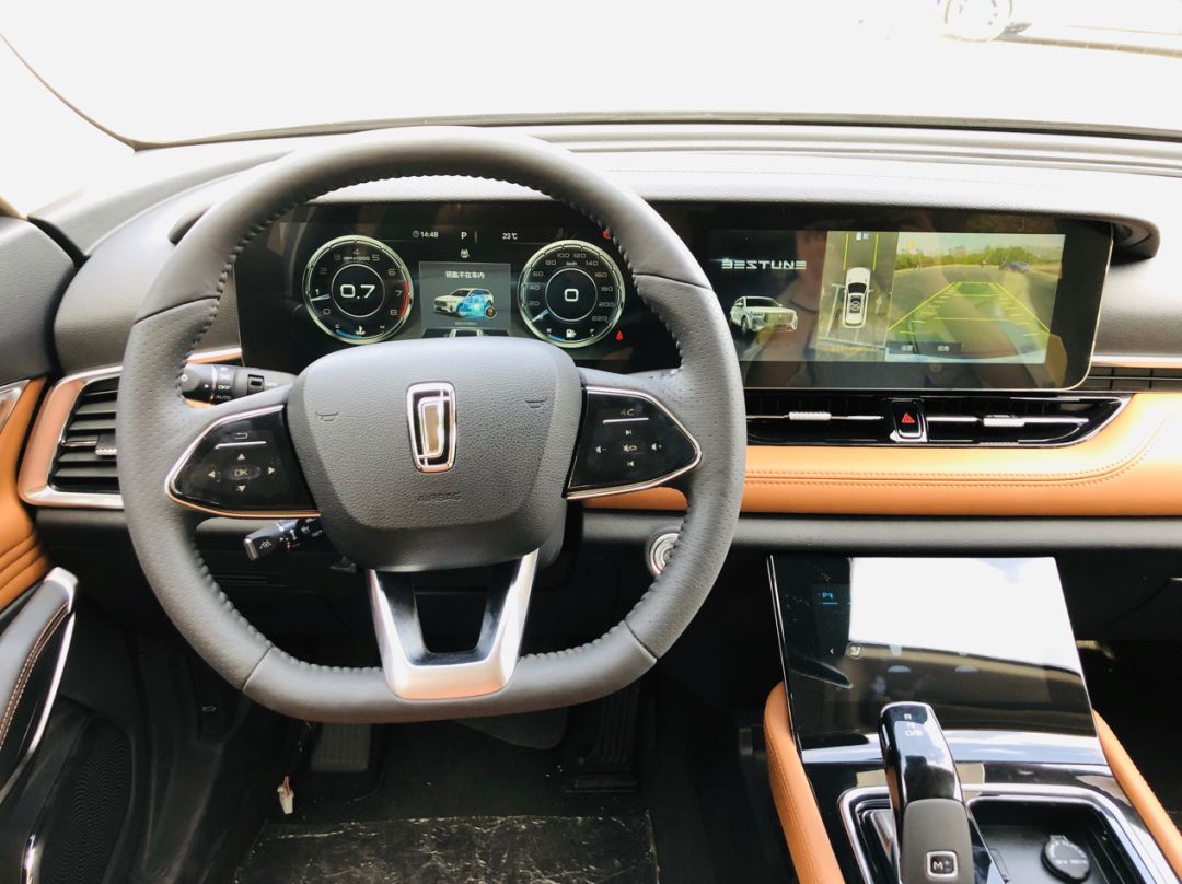 进入车内,奔腾T99的三块大屏的设计颇有豪华品牌的风范,两块中控大屏相互贯穿,左侧虚拟仪表主要显示的是车辆基础信息,右侧的大屏负责360度全景影像显示,下方的中央触控屏则集成了座椅加热、空调控制、大灯角度调节、电动尾箱开闭、天窗开闭、驾驶辅助、自动启停、陡坡缓降等功能,其中大灯角度调节绝对是越级配置。