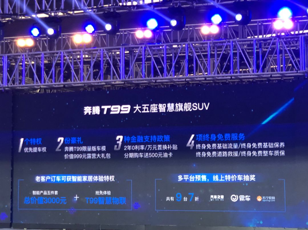 9月19日,奔腾品牌全新车型大五座智慧旗舰SUV——奔腾T99在长春一汽轿车二工厂迎来下线,新车预售同步开启,预售价格为15.99万-19.99万元,在预售期内只要预付9.9元即可享受1个特权、2份豪礼、3种金融支持政策和4项终身免费服务,其中包含含金量颇高的终身免费保养和终身免费整车质保。