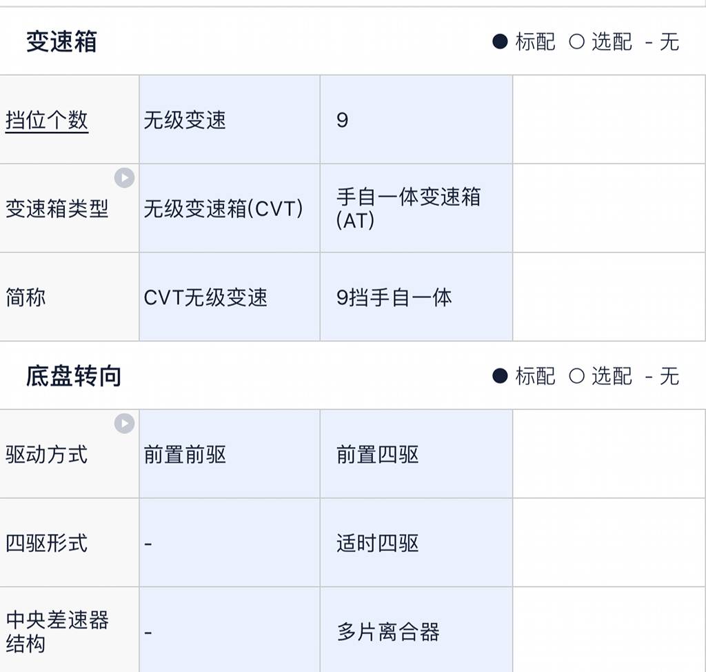 RS CVT两驱劲锐版 对比RS 自动四驱悍锐版 配置明细