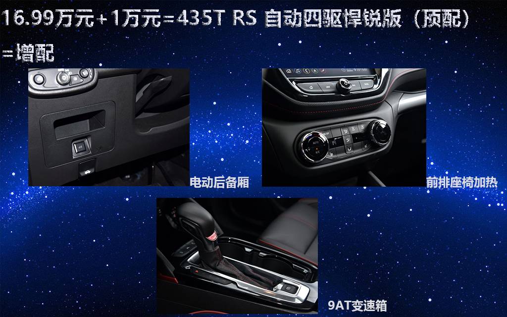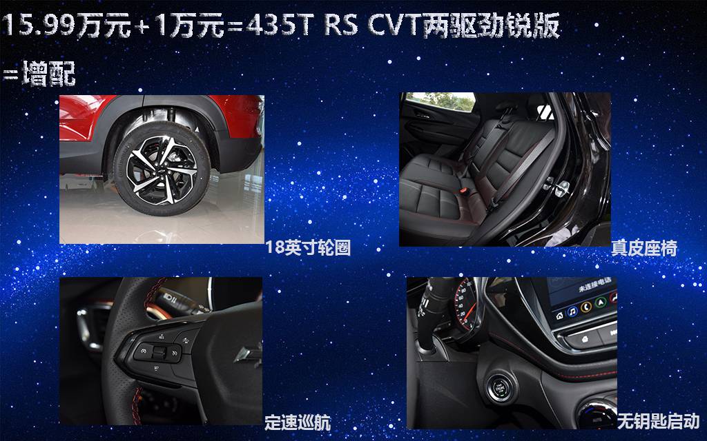 很多人都会觉得顶配车型配置一定不会吝啬,但雪佛兰创界顶配版车型可能让你有些小小失落,外部配置上后备厢升级为电动后备厢,内部仅多了主动降噪功能,唯一值得一提的就是变速箱由CVT换成了9AT,两驱变四驱。如果对驱动形式需求比较高的,可以考虑这款,增价1万元符合该配置成本的提升。