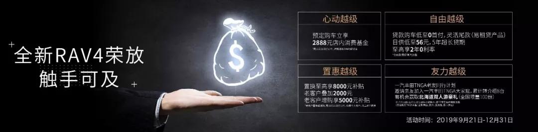 日前,从一汽丰田官方获悉,全新一代RAV4荣放开启预售,预售价为20-24.5万元,其中包括2.0L风尚版、2.0L风尚四驱版、2.0L尊贵四驱版以及2.5L 双擎版精英四驱版四款车型。除此之外,在10月31日之前购车即享2888元红包,一汽丰田推出贷款购车零首付,至高享2年0利率;置换至高享8000元补贴;保客增购享5000元补贴;转介绍购车,双方均有机会赢北海道双人游日本大奖等优惠政策。