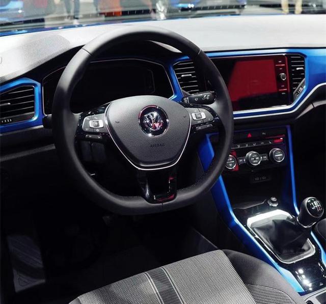 其次内饰方面,T-ROC敞篷版并没有作太大改动,基本沿用了普通版车型的布局设计风格,但在色彩搭配上,新车采用了非常醒目的蓝色,让车内氛围一下变得愉悦欢快起来。同时,新车的各功能区域划分也比较规整,整体实用性非常不错。