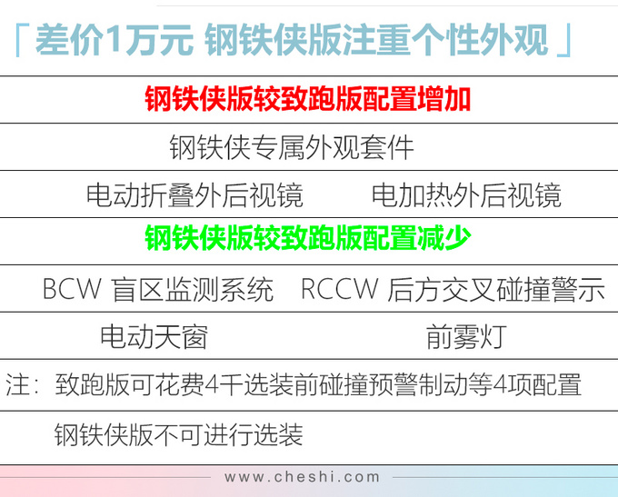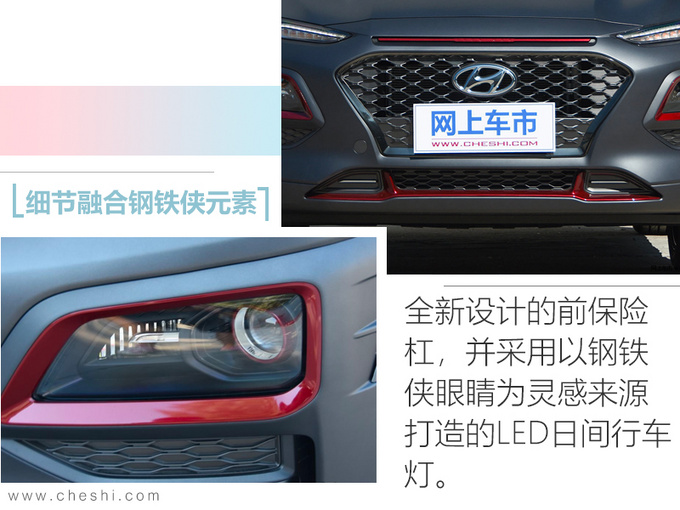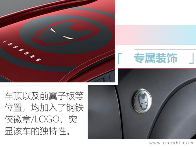 昂希诺钢铁侠版的车身采用双色调设计,配有钢铁侠专属以太红和钛金灰饰面,并且采用18英寸轮毂、LED前大灯、前保险杠红色装饰,多处细节加入IRONMAN及MARVEL字样,重新设计的车身前部酷似面具。新车的内饰同样进行了特殊打造,整体采用红黑双色装饰,液晶仪表盘中融入钢铁侠头盔启动效果,同时在副驾驶前方中控台上增加了专属刺绣,以表明其特别版身份。