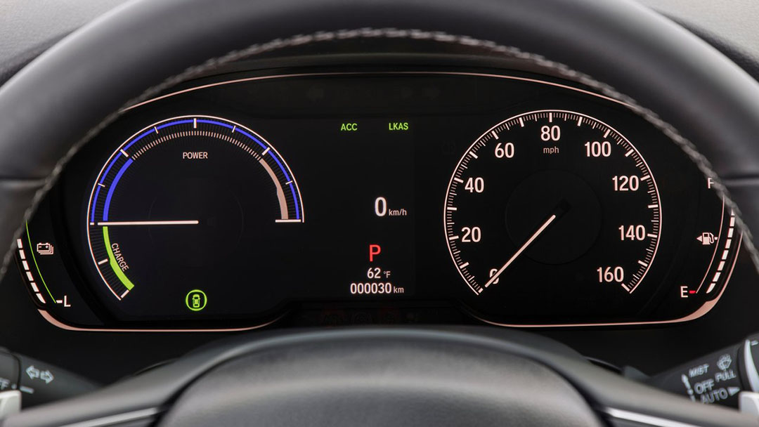 在内饰方面,它设计与思域也保持非常高的相似度,也依然是在细节上有所不同,除了空调出风口造型,它还有一副更沉稳、饱满的三辐式方向盘,也有着雅阁混动一样的按键式电子挡把,仪表盘则是被换成了混动车型专属的、带有能量输出指引的样式。