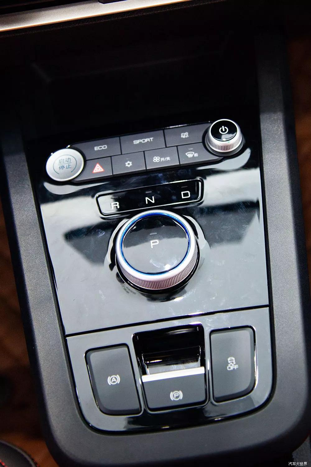 旋钮式的换挡机构是比亚迪e网车型的标准配置,旋钮前方为驾驶模式选择、一键启动、音量、空调控制(部分)等按键,后方则是电子手刹、自动驻车等按键。