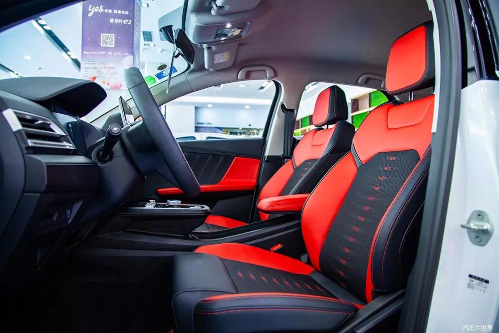 实拍车型的座椅采用了双色的拼色,比较的活跃,其乘坐舒适性和包裹性都还不错。其乘坐空间对于e2这个车型来说表现还是比较可观的,并不会给人造成车身小而空间压抑的感觉。